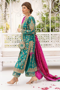 This outstanding shirt is embellished with tila, zari, dabka, naqseh, sequence, resham thread hand work to provide a welcome pop of colour and Swarovski crystals to give it the perfect sheen. To further enhance the beauty of the shirt we have added floral trellis and floral motifs. The back of this exquisite piece has booties which make it heavy and eye catching. To complement with this shirt, we have added emerald green jaamawar izaar pants in pure silk. This breath-taking shirt is paired with a magenta kataan silk dupatta embellished with booties.