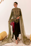 An absolute elegant raw silk black shirt with a heavily embroidered and embellished front and tassels adding to the detail and exquisitely of this fit. Its paired with chooridaar pajama and a beautiful green dupatta filled with sequin chatta and embroidered and embellished border.