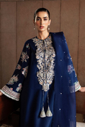 This classic navy blue raw silk long shirt has embellishment details of silver nakshi, sequins, gota, mukesh, orange, ice blue and green cut dana on neckline. The sleeves are heavily embellished with pink , orange and green sequins, cut dana and silver kiran at the hem. Its paired with red raw silk palazzo pants with borders embroidered and embellished with silver sequins, naqshi, buggle beads and pipes. The outfit contains 3 yards organza dupatta with sequin spray all over.